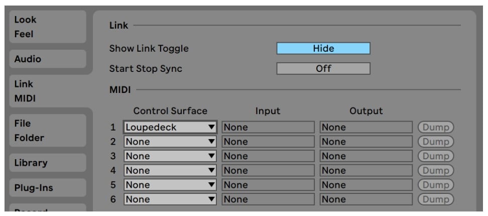 Before Loupedeck CT or Live can work with Ableton Live, you need to activate Loupedeck CT/Live as a control surface in the MIDI setup section of Ableton Live’s preferences like shown in the picture below.