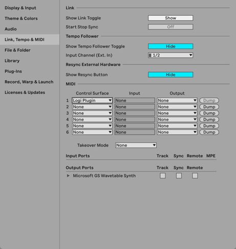 Before CT/Live can work with Ableton Live, you must 1) first run the installer and 2) activate "LOGI PLUGIN" (or "Loupedeck in 5.9 and previous versions) as a control surface in the MIDI setup section of Live’s preferences.