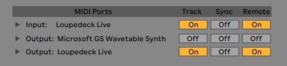 In order to use Loupedeck's MIDI plugin feature, you should turn on the MIDI tracking and remote input and output in the Ableton MIDI Port options.