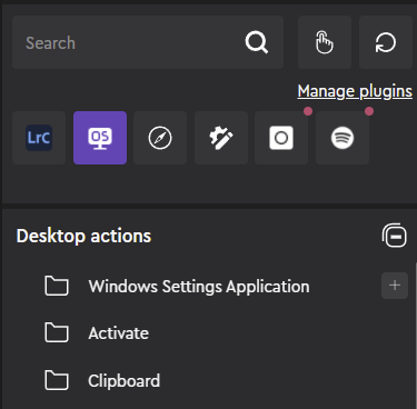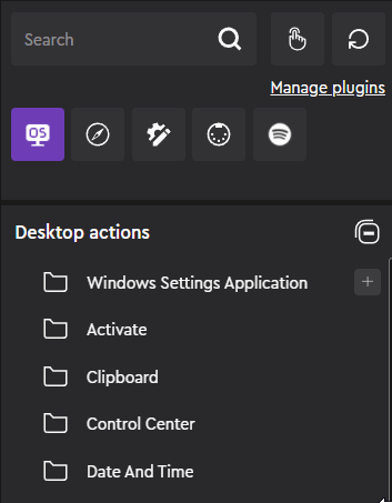 To add more actions from universal plugins (e.g., Spotify Premium, Twitch, OBS Studio - which are available for all profiles), click on "Manage plugins".
