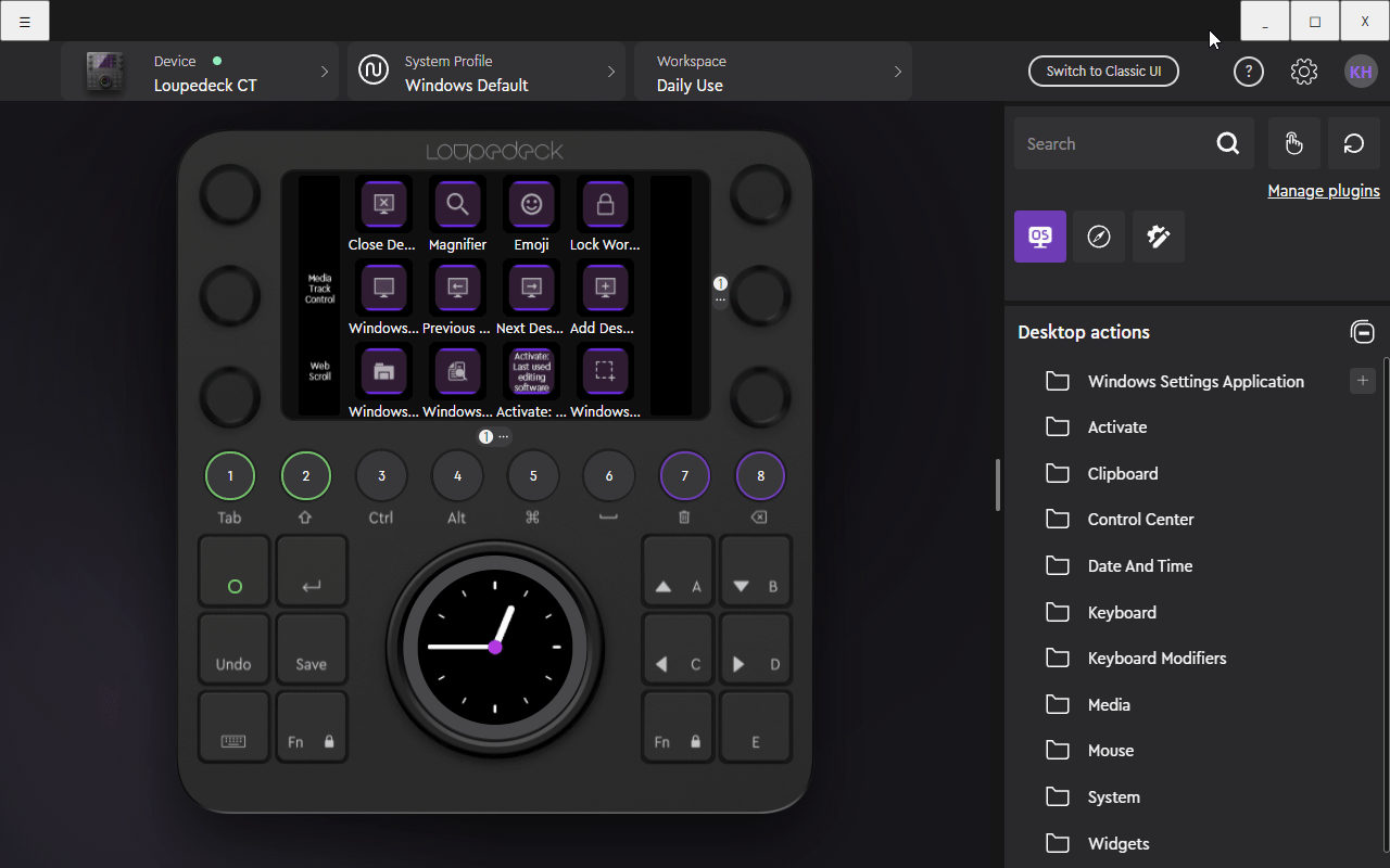 The right side of the Loupedeck UI is dedicated for the action panel. You can browse through the action list and assign actions (by dragging and dropping) to your Loupedeck device.