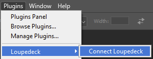 Tip! We suggest that Loupedeck Info panel is minimized and left on Photoshop's desktop - this way you don't need to open it from the plugins menu again (but you still need to maximize the Loupedeck Info panel to let it connect).