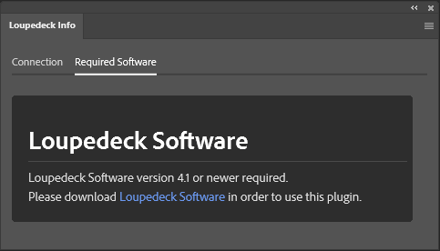 Note! Loupedeck Info panel needs to be opened each time Photoshop starts to create the connection. After the connection is made Loupedeck Info panel can be closed.