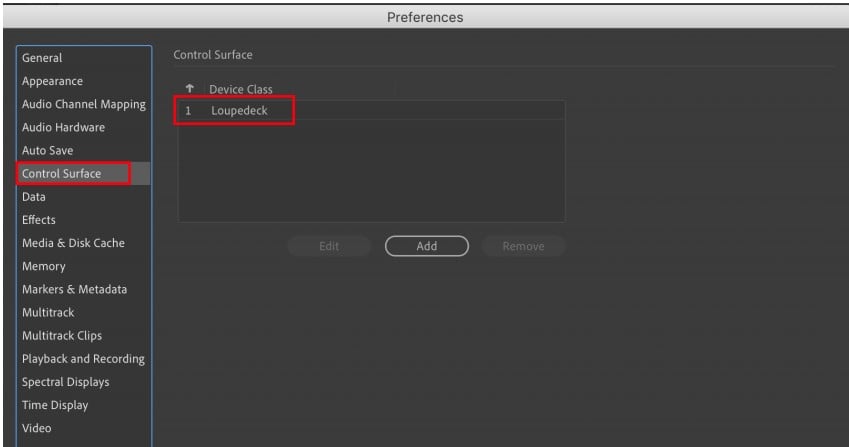 Before Loupedeck CT/Live can work with Adobe Audition, you need to activate it as a control surface in the Audition preferences. (See picture 1).