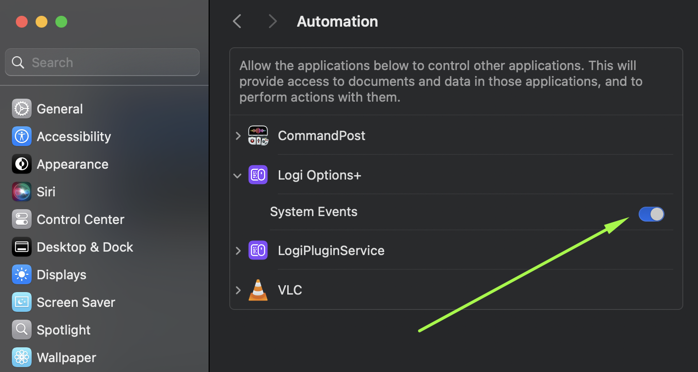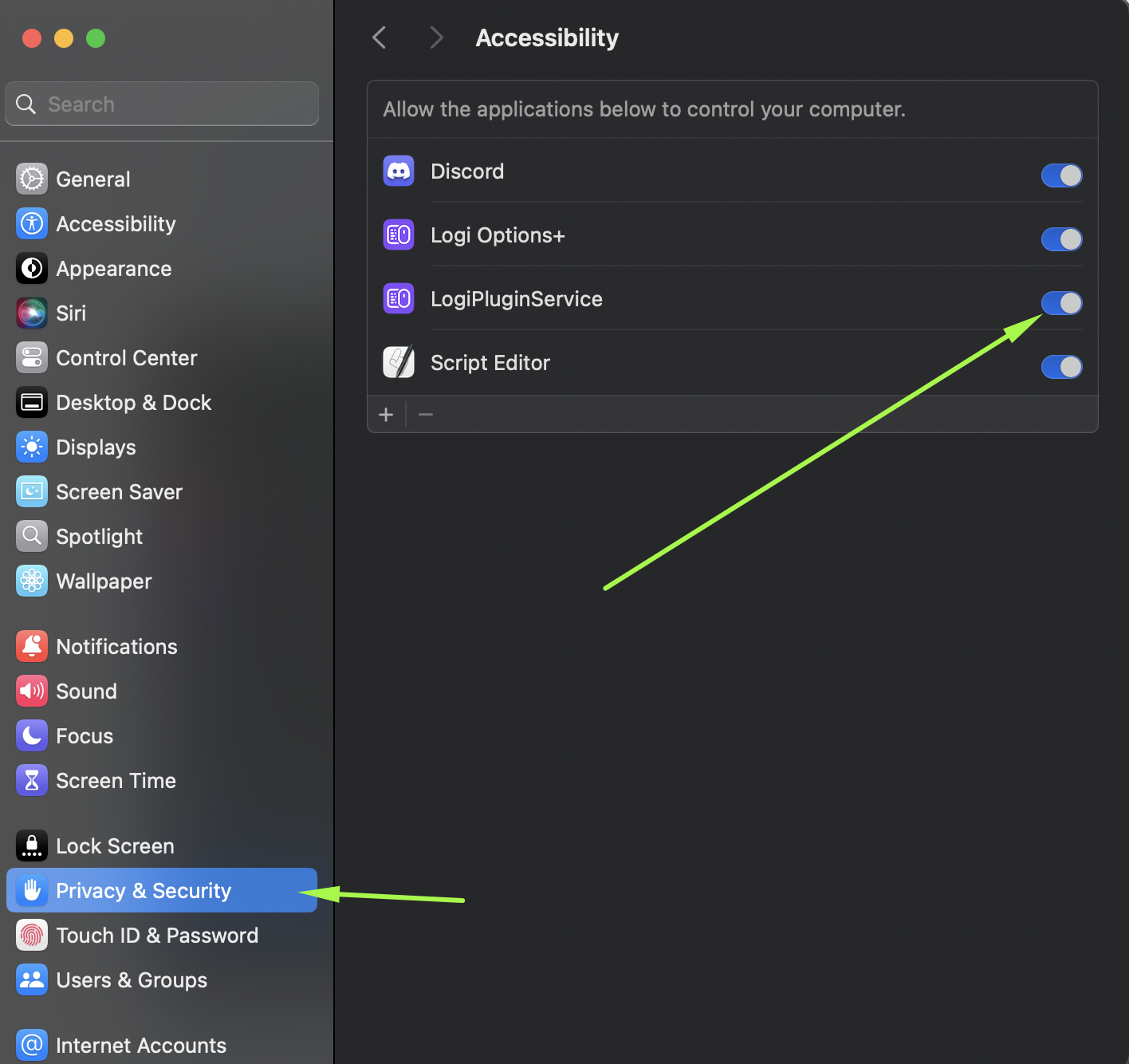 Some macOS versions require that you add Logi Plugin Service in the Automation settings (System Settings -> Privacy & Security -> Automation). Check to make sure that the System Event box is checked under Installer.