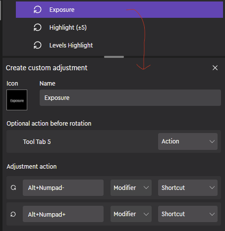 - Click the action (e.g., Exposure) to open it within the Action Editor (appears at the bottom of the action panel).