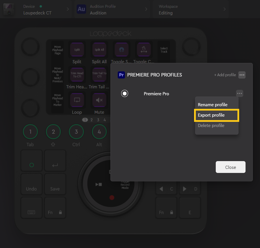 In Loupedeck software you can export your profiles one-by-one as a back-up, or just to copy the profile to your friend or to another computer.