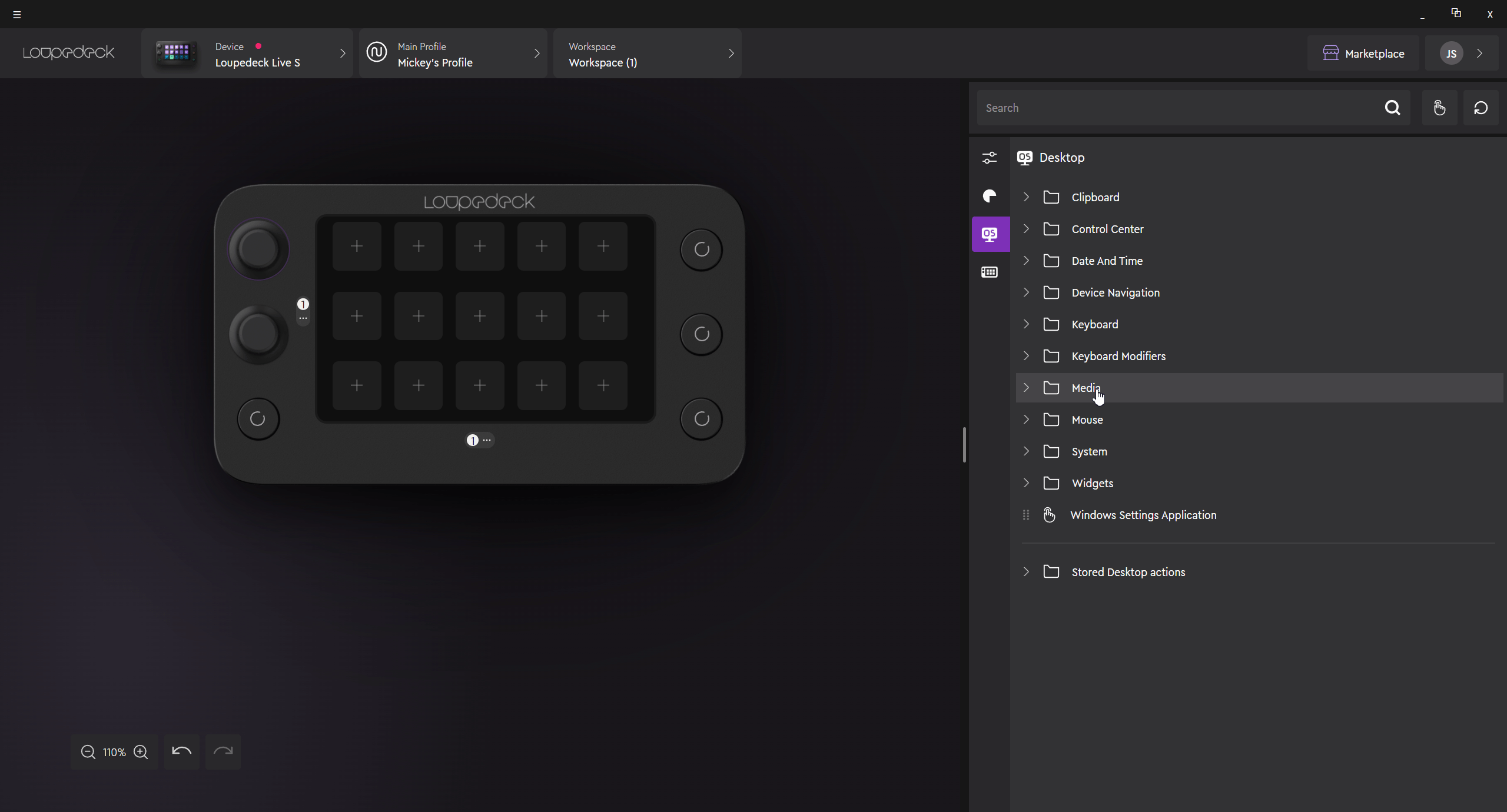 To assign the adjustment, drag & drop the adjustment from the right side action panel onto the dial you wish to assign it to. Note that volume adjustment also assigns the mute action as the dial press action by default.