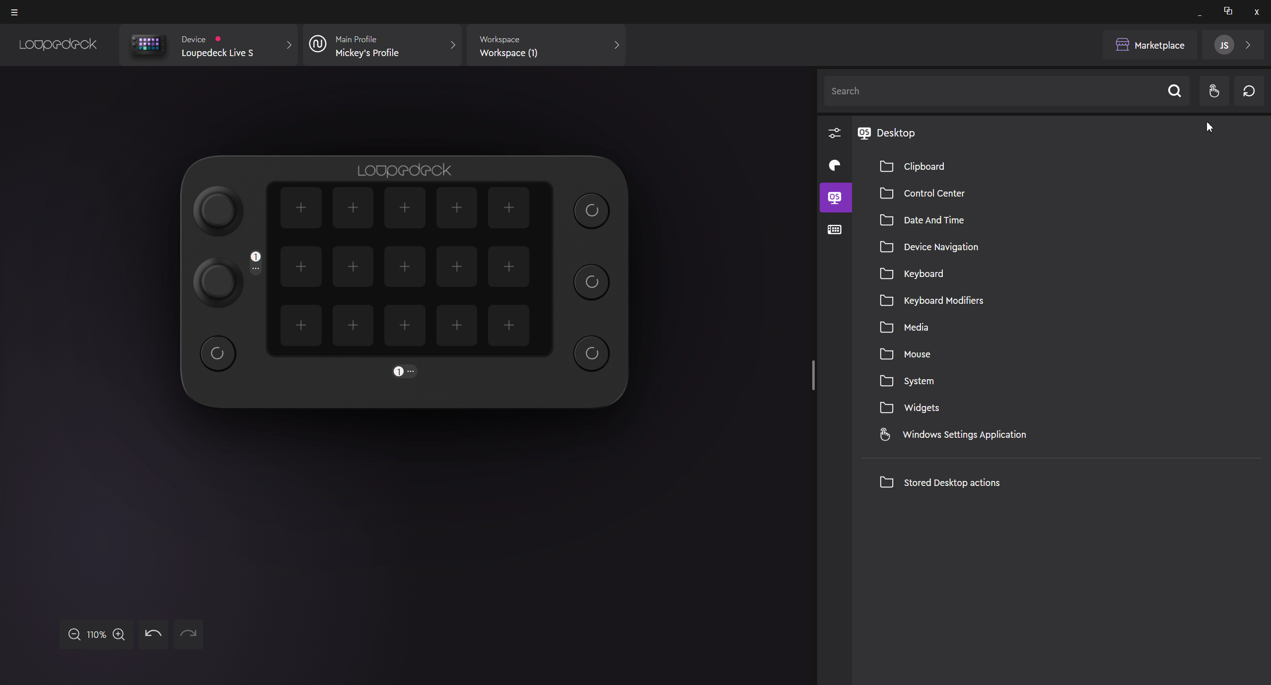 Custom actions and adjustments can be assigned from two different places, from the right side action panel or you can create the action straight on the touch button.