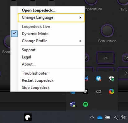 Right-Click on the Loupedeck icon on the Windows system tray in the lower right corner. You will see a menu pop up like in the picture below. Choose Change Language (lined with yellow color in the picture) and click on the language you want to use. Done!