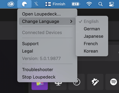 Click on the Loupedeck icon on the upper right menu bar. You will see a menu like in the picture below.  Choose Change Language and click on the language you want to use.  Done!