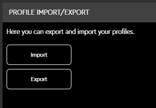 From the settings window, click on "Profile" to gain access for importing and exporting profiles. These are shown on the right side of the settings window.