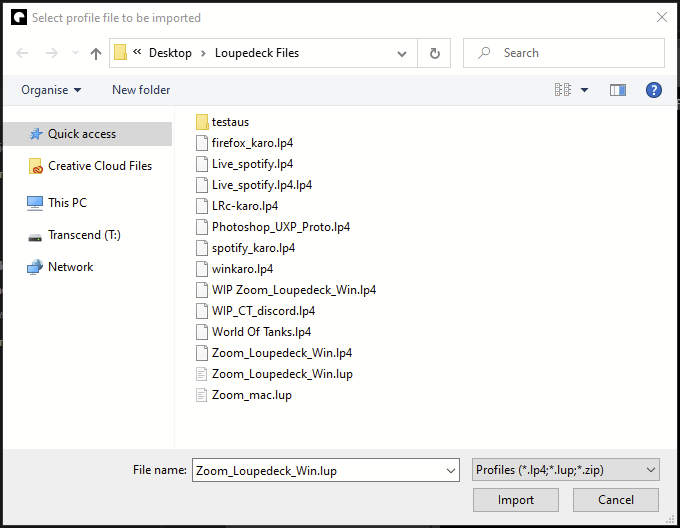 Pressing Import Profile will open a folder management window, where you can choose the profile you wish to import. The system should automatically recognize the software it is used with.