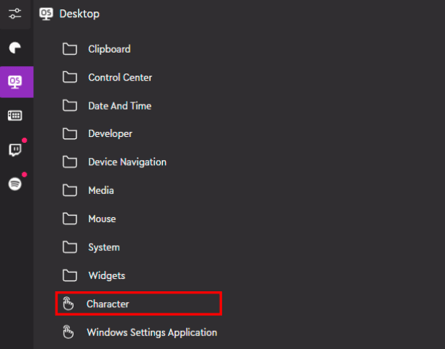 新しいCharacterアクションは 以前の "Key commands" アクションに代わって、"デスクトップ" カテゴリーの中に配置されています。