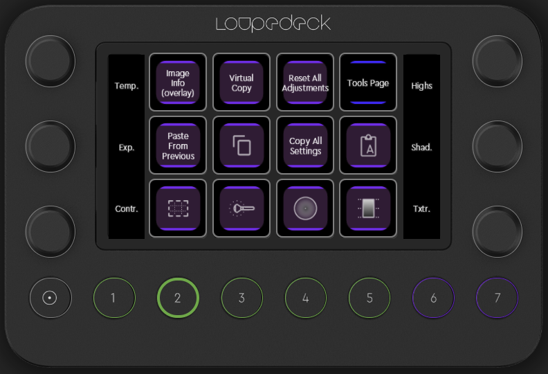 Loupedeck Live is utilizing all the control elements to efficiently cover all the main functionalities of Lightroom. Workspace elements (touch buttonsand dials) change based on the selected workspace - these are explained in separate articles. System elements (round buttons) stay the same throughout your editing process.