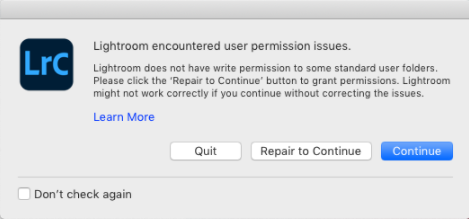 If you see Lightroom message about permission issues and clicking the Repair to Continue button does not resolve it, please follow our troubleshooting tips below.