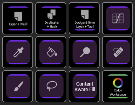 Loupedeck's Photoshop profile is made to be as simple and fast to use as possible. This means that the main functions are directly accessible from the round and square buttons and the amount of workspaces has been kept minimum.