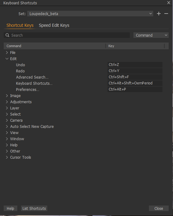 - Find the corresponding action from Capture One's shortcut list and add a shortcut