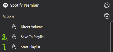 When Spotify is linked with Loupedeck, Spotify Premium plugin reads all the playlist titles and enables you to start playback (1) on any of your playlists or to save (2) played song to a playlist.