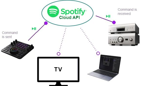 When (e.g.) play/pause is pressed from Loupedeck device, the command is sent to Spotify Cloud. Spotify cloud knows which of your playback devices is the active one (e.g., the amplifier) and forwards the command to that device.