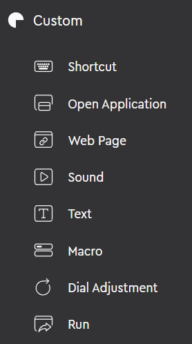 You can also create custom actions like macros, sound actions and open application - actions from the Custom-tab on the action panel.