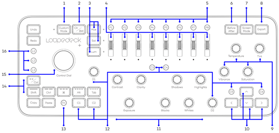 Even though it’s quite easy to understand what the buttons, dials, and scrolling wheels on Loupedeck+ do, here's a checklist in case you want to check a function.